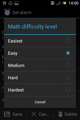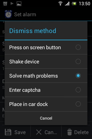 Nah... Ini fitur uniknya ayng membedakan dengan alarm biasa.. Ada beberapa pilihan cara yang dapat digunakan untuk mematikan alarm, seperti mengocok device, menyelesaikan soal matematika (ini yang paling saya suka), sampai disuruh jalan-jalan cari mobil dan meletakkan device ke dalam docknya ( ribet banget yah -_-' ). Semua tergantung selera Sobat dan seberapa kejam Sobat, hehehe...