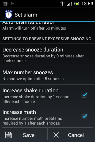 Dari situ kalo jawaban kita bener maka alarm akan berhenti, kalau salah maka alarm akan terus berbunyi sampai Sobat bisa menjawab dengan benar. Sedikit tambahan lagi ternyata aplikasi ini juga punya fitur untuk memberikan hukuman bagi yang melakukan Snooze. Jadi semakin banyak melakukan Snooze maka soal yang diberikan akan semakin susah sehingga alarm akan semakin susah pula dimatikan.