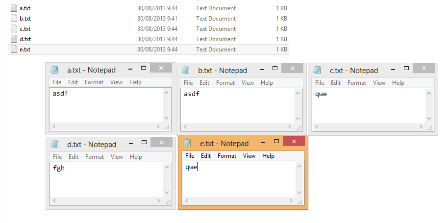 Pada gambar diatas terlihat bahwa file a dan b kembar, file c dan e juga kembar. Kemudian kita coba cari dengan Duplicate File Finder, dan hasilnya adalah sbb :