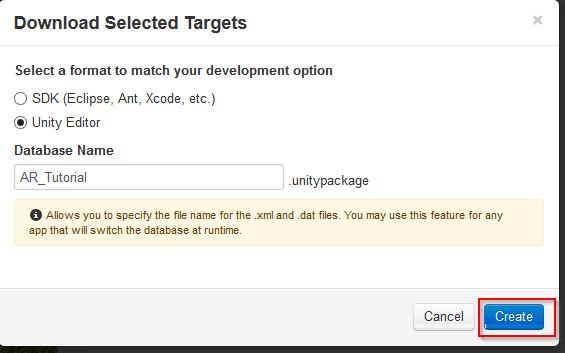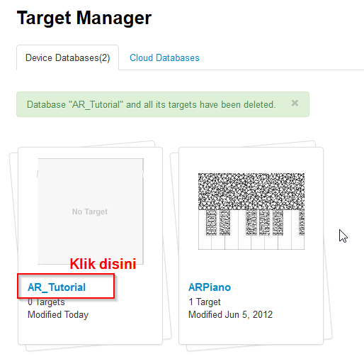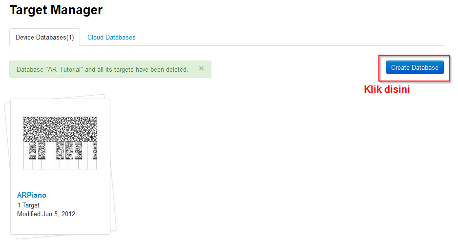 Kembali di websitenya Vuforia, disitu sobat akan ditunjukkan projek apa saja yang pernah sobat buat. Untuk membuat project baru klik 'Create database' dan masukkan nama sesuai selera. Pada tutorial ini nama yang dipilih adalah 'AR_Tutorial'