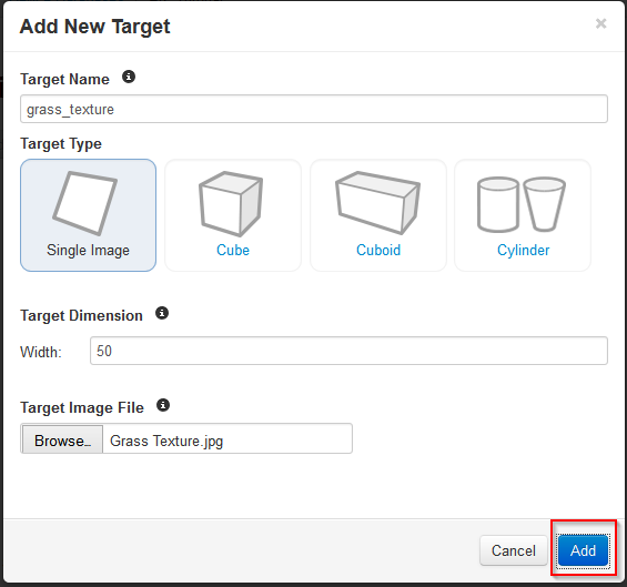 Imagetarget yang dibuat akan ditampilkan kosong. Klik imagetarget kosong yang baru tersebut untuk mengupload marker sesuai keinginan sobat.