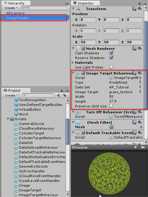 Selanjutnya lihat kembali Image Target dan lihat pada bagian Inspector. Lakukan konfigurasiseperti pada gambar di bawah