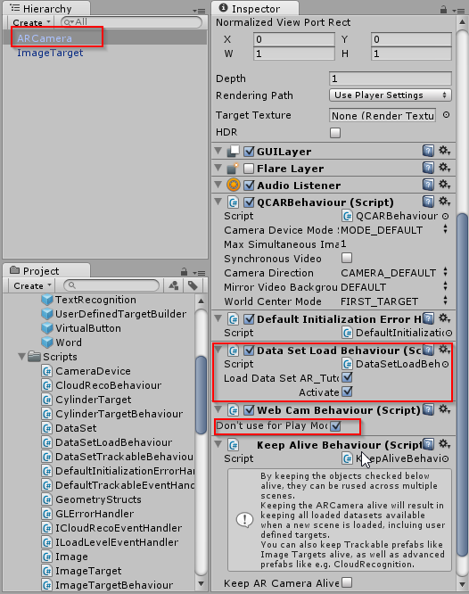 Jangan lupa melakukan konfigurasi pada ARCamera untuk me load target.