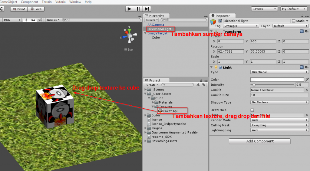 Langkah berikutnya adalah ujicoba, buat objek cube di atas marker. Klik Game Object >> Create Other >> Cube. Selanjutnya posisikan cube sedemikian rupa di atas marker