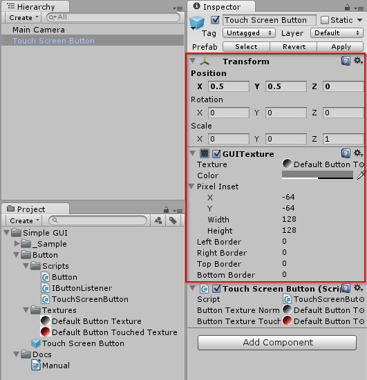 Kemudian lakukan pengaturan letak button. Pengaturan button sama dengan pengaturan GUITexture pada umumnya. Baca : Dokumentasi Unity GUITexture