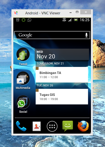 Salah satu aplikasi VNC Server dalam platform android adalah Droid VNC Server, dan untuk VNC Client yang diinstall di PC, Anda dapat menggunakan Real VNC Viewer.